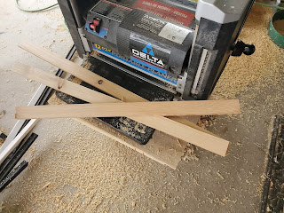 I needed the thickness of the boards to be dead on, so next was to run them all through the planer. I did start with the legs, slowly bringing them down to the 3/4" that I needed, and then turned my attention to the thin strips for seat slats. They were about 3/8" thick, so it didn't take a lot of time to get them down to the right thickness. 3/8" thick would have actually been fine for slat thickness, but I shot for 1/4".