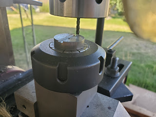 In the previous photos, I had not yet cut two other slots (not all the way through) on the chucking nut in order to properly grip the screws. Set in the chuck after the cuts, I proceeded to drill a 5/32" hole as a start, re-chamfer the entry point on the drill, then broach it through.